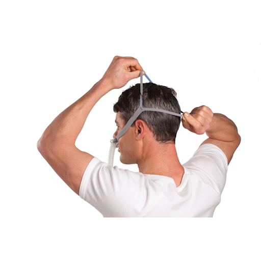 QuickFit Elastic Headband: The QuickFit harness provides a secure fit without the need for Velcro straps or clips. The elastic fabric harness is designed to fit snugly around the back of your head. The split back straps can be spread apart for a looser fit or pulled together for a tighter fit. The AirFit P10 features a gray and blue harness. The gray side is worn outwards, the blue side inwards. The AirFit N30 harness can also be used instead of the AirFit P10 harness.